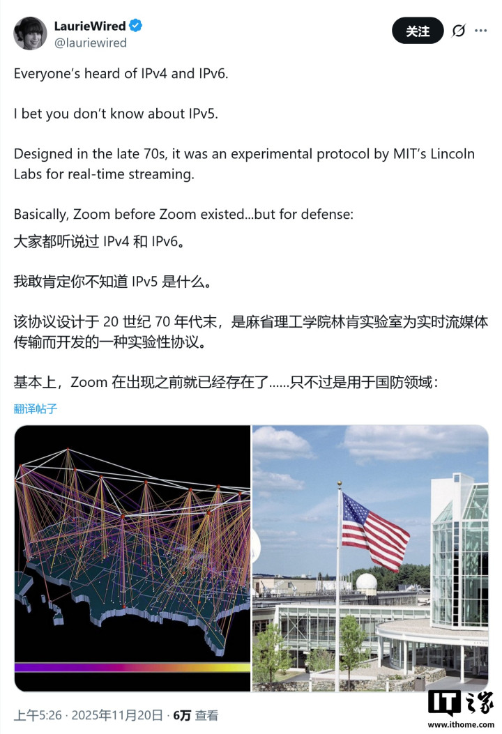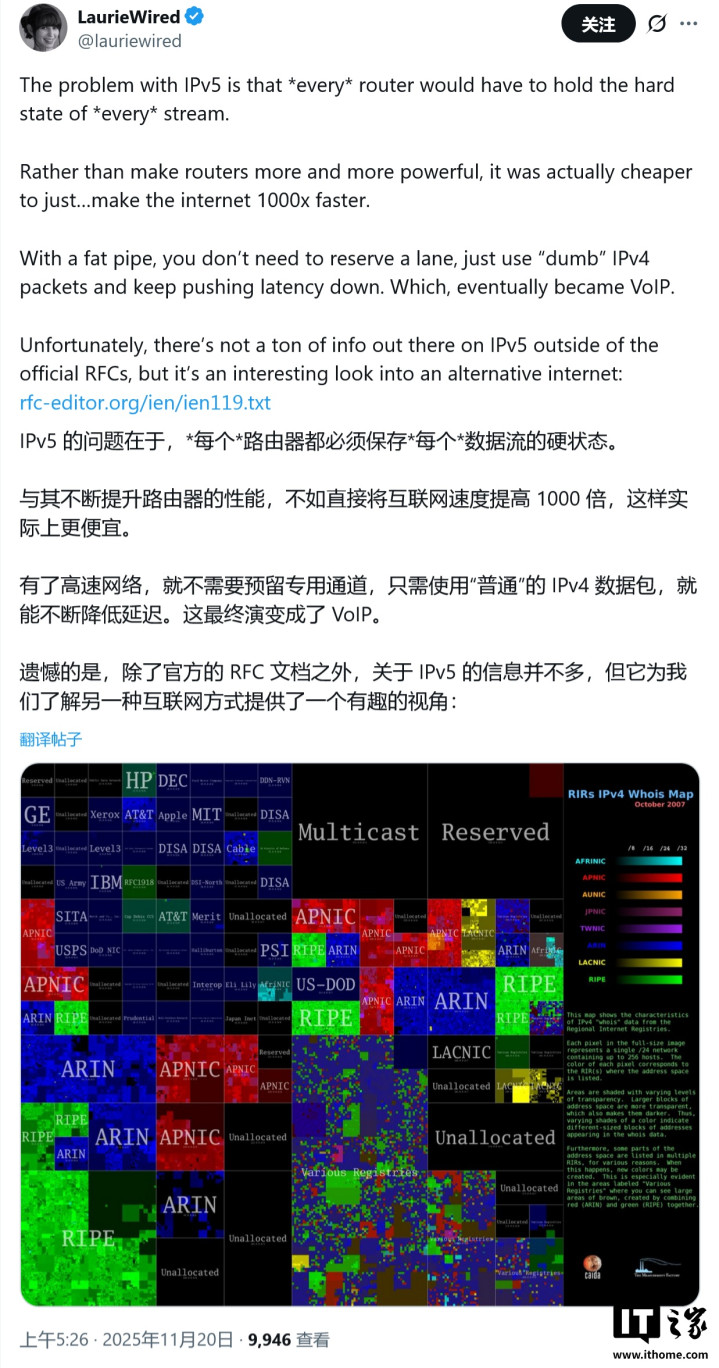 IT之家11月24日消息,科技媒体Tom'sHardware昨日(11月23日)发布博文,报道称互联网发展史上有一个著名的断层:我们从IPv4直接跨越到了IPv6,中间的“5”去哪了?其实,IPv5并非像跳过Windows9进入Windows10那样的营销策略,而是真实存在的实验性协议。