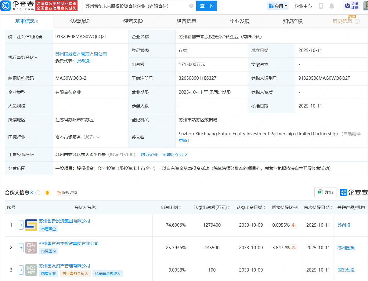近日,苏州新创未来股权投资合伙企业(有限合伙)成立,出资额171.5亿元,经营范围包含:股权投资;创业投资(限投资未上市企业);以自有资金从事投资活动。企查查股权穿透显示,该公司由苏州创新投资集团有限公司、苏州国有资本投资集团有限公司等共同持股。